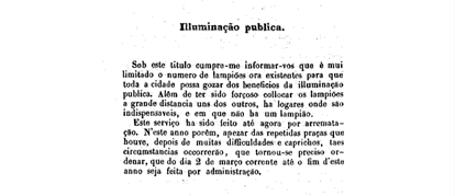 Na seção “Iluminação”, por sua vez, destaca-se que se cumpria informar que era muito pequeno o número de lampiões para que toda cidade pudesse se beneficiar da iluminação pública. “Além de ter sido forçoso colocar os lampiões a grande distância uns dos outros, há lugares em que são indispensáveis e em que não há um lampião”.