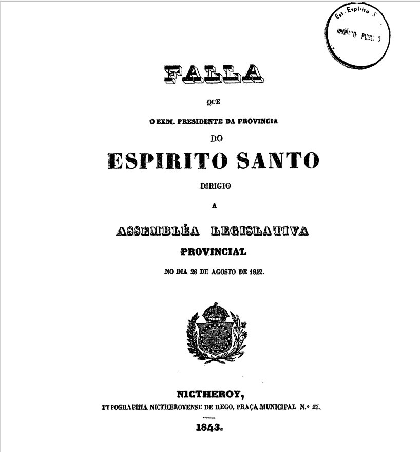 No relatório do presidente de Província, Jose Francisco de Almeida Monjardim, publicado em 1848, temos um exemplo dos dados que eram divulgados neste tipo de documento. No item “Tranquilidade Pública” afirma-se que o Espírito Santo se encontrava em perfeita tranquilidade e seus habitantes davam provas de respeito às instituições juradas e de que amavam a ordem pública e o adorado imperador.