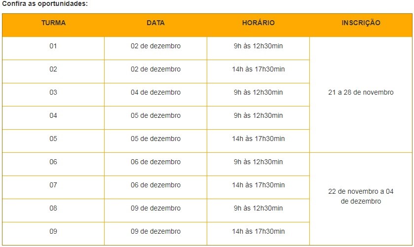 Os servidores interessados em participar das atividades devem ficar atentos aos prazos. Para as cinco primeiras turmas, as inscrições serão realizadas entre os dias 21 e 28 de novembro. Já para as outras quatro, o prazo começa no dia 22 de novembro e segue aberto até o dia 04 de dezembro. A inscrição deverá ser realizada no setor de Recursos Humanos do órgão onde o servidor atua.