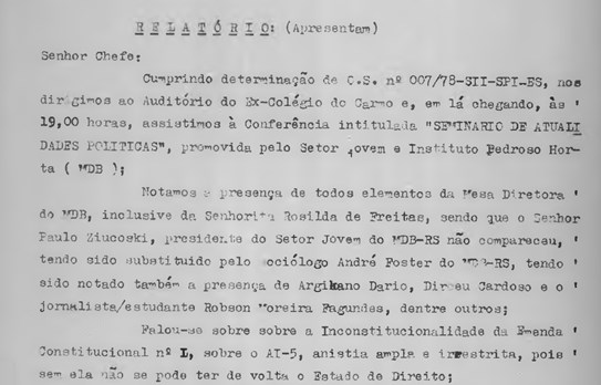 No dia 22 de maio de 1978, em um relatório enviado por três policiais ao chefe do Serviço de Investigações e Informações (SII), eles descrevem o que presenciaram durante a conferência “Seminário de Atualidades Política”, ocorrida no auditório do Colégio do Carmo no Centro de Vitória. Contam terem ouvido críticas à “Revolução de 1964”, sendo as contestações feitas por todos os presentes e que no evento foi solicitado um minuto de silêncio pelos mortos por questões políticas. Terminam dizendo “Isso foi o que conseguimos ouvir e deduzir”. O documento traz um exemplo das diversas ações de vigilância e repressão exercidas pela DOPS no Estado.