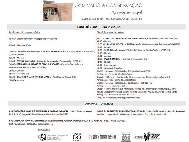 Na programação, que é aberta aos interessados na área da conservação do patrimônio cultural, vão acontecer conferências, grupos de trabalho e oficinas, possibilitando a troca de experiência entre os participantes. Na página no Facebook (https://www.facebook.com/pages/Seminário-de-Conservação-Acervos-em-papel/838424409504356) estão disponíveis a programação e a ficha de inscrição, que deve ser preenchida e enviada para o e-mail seminario.secult@secult.es.gov.br.