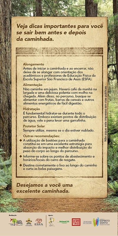 Outra dica é não caminhar em jejum. Haverá café da manhã na largada e polenta com molho na chegada. Além disso, é aconselhável que o caminhante consuma frutas, barras de cereais e outros alimentos de fácil digestão. No local não ocorrerão venda de kits. É fundamental, portanto, o uso de roupas leves e confortáveis, de chapéus e bonés e de filtro solar. Recomenda-se levar garrafinhas para a hidratação em todo o passeio, no qual haverá distribuição de água em diversos pontos.