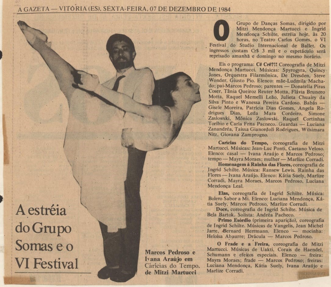 “Era uma época de muita luta. Final da década de 1970. Era tudo mais difícil. Transportes. Deslocamentos. Você imagina... Como bailarina, eu e minhas colegas sempre pensamos em profissionalizar a nossa atividade, o que culminou com a formação do ‘Grupo Somas’ na década de 1980, que foi a primeira companhia profissional do Espírito Santo. Por um longo período eu me dediquei exclusivamente à dança”, relata.