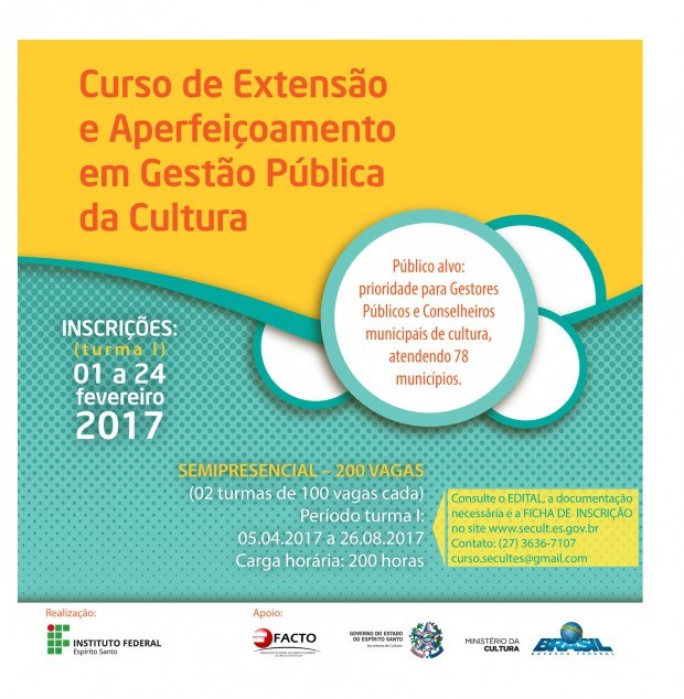 As inscrições para o curso de Extensão e Aperfeiçoamento em Gestão Pública da Cultura já estão abertas. O curso será ofertado pelo Ministério da Cultura (MinC), por meio do Instituto Federal de Educação, Ciência e Tecnologia do Espírito Santo (Ifes), em parceria com a Secretaria de Estado de Cultura (Secult) e a Fundação de Apoio ao Desenvolvimento da Ciência e Tecnologia (Facto).  O Minc descentralizou o recurso de R$ 303 mil ao Ifes para a execução do Projeto. Confira o regulamento, o requerimento da matrícula e os demais anexos de documentação aqui. É preciso enviar todos os documentos em anexo para efetuar inscrição. Mais informações pelo telefone 3636.7107 ou pelo email: curso.secultes@gmail.com. As inscrições terminam no dia 24 de fevereiro.