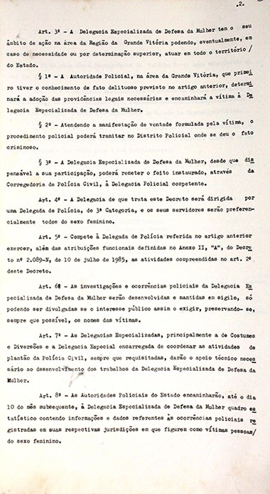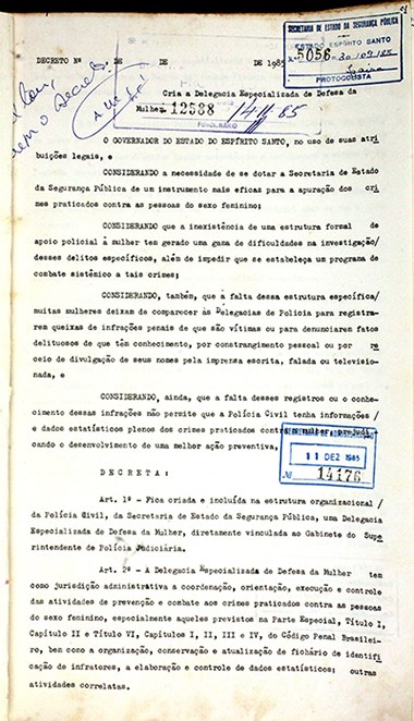 São diversos os temas abordados nos processos. Dentre eles, está o Decreto Nº 2170 N, de 24 de outubro de 1985, que dispõe sobre a criação da Delegacia Especializada na Defesa da Mulher. É relatada a falta de uma estrutura específica no Espírito Santo voltada aos crimes contra as mulheres, o que prejudicava o desenvolvimento de ações preventivas. São ressaltadas as dificuldades enfrentadas para a implantação, assim como a experiência positiva do Estado de São Paulo.