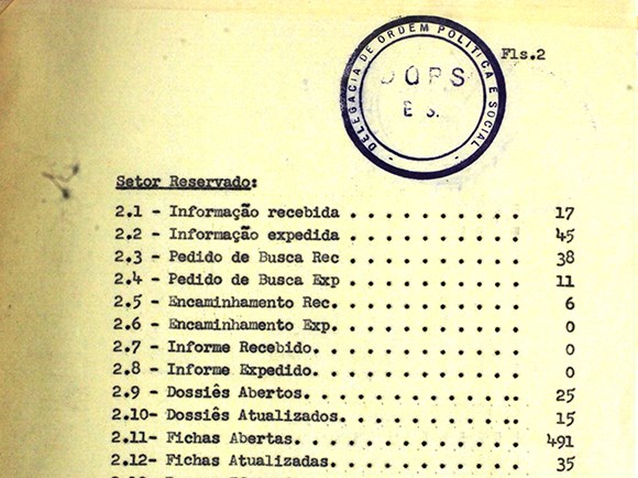 Um dos relatórios da Corregedoria de Polícia traz a súmula das atividades da DOPS-ES referente ao mês de outubro de 1974, época na qual o país encontrava-se sob a Ditadura. Nos documentos, há dados do Serviço de Investigação e Informações, dentre eles os ofícios recebidos e expedidos, as rondas efetuadas e as diligências e os dossiês abertos e atualizados. Destacam-se o requerimento e a emissão de 750 “Atestados de Ideologia Política”, que comprovavam a inexistência de fichas no órgão.