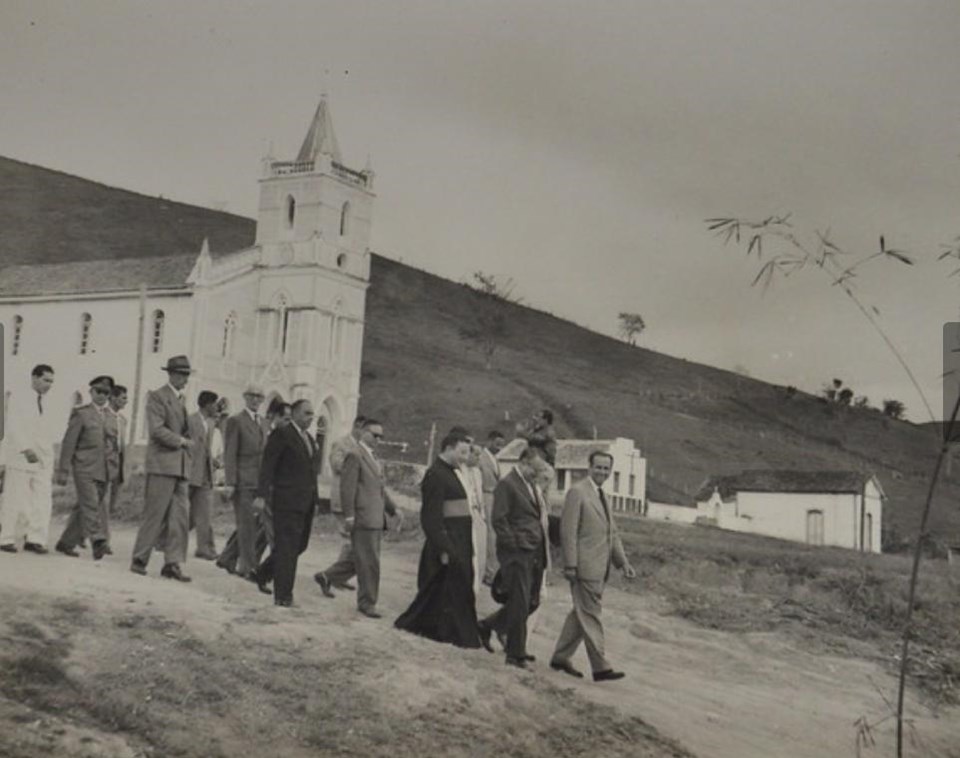 Legenda da fotografia: Guaçuí, 1953. Governador Jones, deputado Dr.Chiquinho, Leoncio Vieira de Rezende, Bento Gomes de Aguiar, Padre Acácio Valentim.