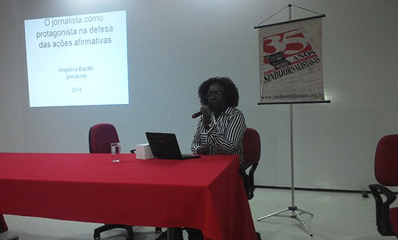 A palestrante e membro da Cojira-RJ, Angélica Basthi, abordou o tema “O jornalista como protagonista da defesa de ações afirmativas” e destacou a necessidade de ações pró-ativas por parte dos profissionais da imprensa na reversão das inserções de estereótipos relacionados aos negros na mídia. Segundo Angélica, é notório que a imprensa, enquanto entidade influenciadora de comportamentos e opiniões, ainda reproduz noções e posturas racistas.