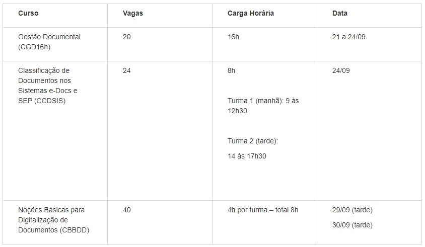 Serão 84 vagas em três cursos: “Gestão documental”, “Classificação de Documentos nos Sistemas e-Docs e SEP” e “Noções Básicas para Digitalização de Documentos”.