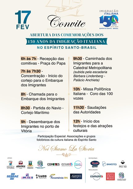 O evento é uma realização da Associação Federativa Italiana do Espírito Santo (Comunità) e do Arquivo Público do Estado do Espírito Santo (APEES) com a colaboração de diferentes entidades.