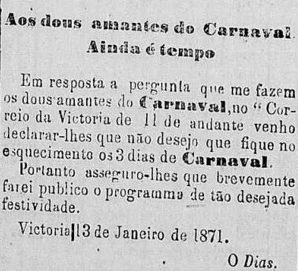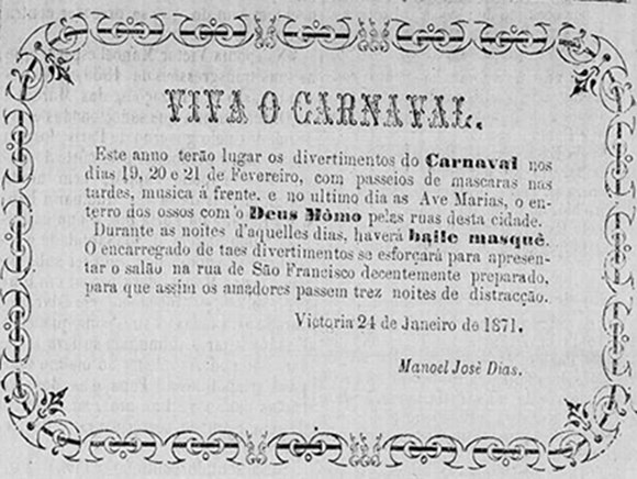No dia 10 de fevereiro de 1864 o jornal "Correio da Victoria", o primeiro com circulação periódica no Espírito Santo, trouxe a seguinte notícia: "Aplaudiu-se nos dias 7,8 e 9, os festejos carnavalescos, como era de esperar da bela rapaziada, percorrendo as ruas grande número de máscaras". Trata-se de uma das primeiras menções documentadas sobre o carnaval na cidade de Vitória. Por meio do acervo do Arquivo Público do Estado do Espírito Santo (APEES) pode-se conhecer um pouco mais das características dos carnavais que agitavam a cidade e envolviam os moradores nos desfiles dos mascarados, na compra das fantasias e nas serpentinas dos salões da Rua São Francisco.