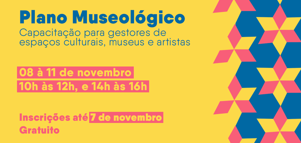 Estão abertas as inscrições para o curso de capacitação on-line Plano Museológico, que tem como objetivo capacitar gestores de museus, gestores culturais, profissionais de diversas áreas (arquivistas, museólogos, artistas plásticos, arquitetos, historiadores, biblioteconomistas, sociólogos etc) e estudantes. Transmitido por meio da plataforma de colaboração Microsoft Teams, o curso on-line vai ocorrer de 08 a 11 de novembro e é uma parceria entre a Secretaria da Cultura (Secult) e o Instituto Brasileiro de Museus (Ibram).