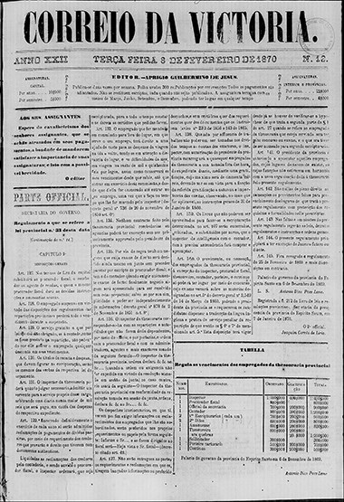 Somente quando se tornou uma necessidade oficial dar publicidade às decisões do Executivo é que se inicia a imprensa capixaba. Essa preocupação mostra-se presente quando, em 1835, o presidente da Província encaminha um ofício ao Império reclamando a falta de uma tipografia na qual os atos da Assembleia pudessem ser impressos. Ela surge apenas em 1840, por iniciativa do alferes Ayres Vieira de Albuquerque Tovar, e nela é publicado o primeiro jornal capixaba, “O Estafeta”, que não passou da edição inaugural. A imprensa começa efetivamente com o “Correio da Victoria”, em 1849.