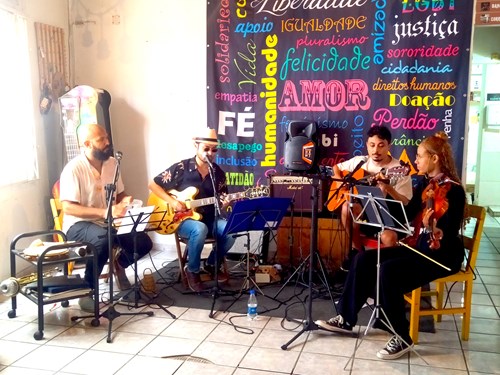 Bruno Ishisaki é doutor em Música (Unicamp), compositor, cancionista e docente na Fames. Tiago Bezerra é publicitário e graduando em Licenciatura na Fames. Gessé Paixão é cantor, cancionista, instrumentista, professor de Filosofia e graduando em Licenciatura na Fames. Julia Bolina é cantora, instrumentista e graduanda em Licenciatura na Fames.