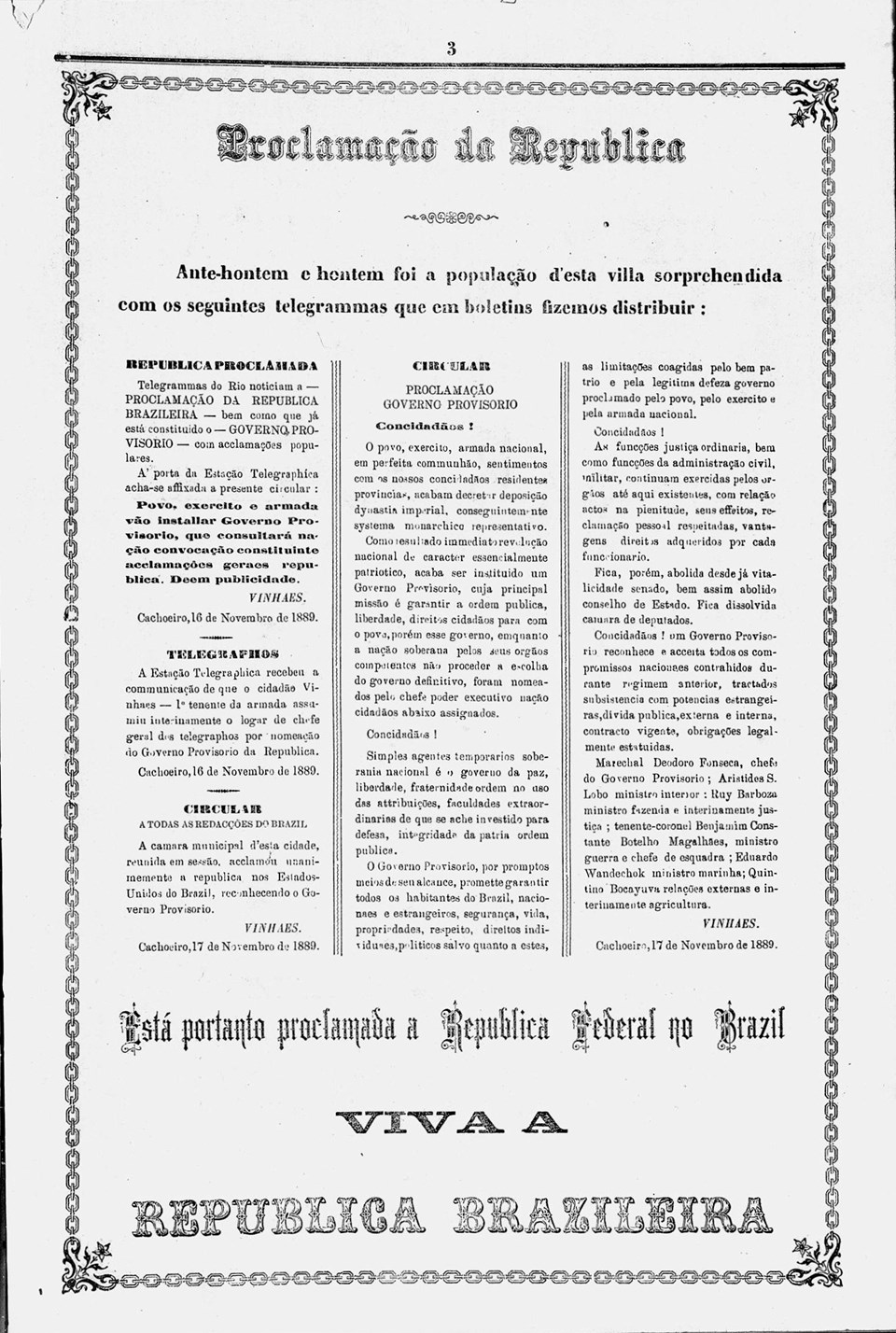 No periódico do dia 28 de novembro de 1889 o tema continua a ser discutido. São expostos o decreto do Governo Provisório e a mensagem dirigida a Dom Pedro II pelo marechal Deodoro da Fonseca. Descrevem-se também as festividades ocorridas, mostrando a força das ações republicanas: “No dia 16 do corrente às 6 horas da manhã, depois de afixada na porta da estação telegráfica a circular que distribuímos em boletins e que já foi publicada em nossa edição especial do dia 18, imediatamente a banda de música Euterpe Cachoeirense reunida na casa do cidadão João Loyola, proprietário de ‘O Cachoeirano’ e um dos que muito trabalhou em prol da causa republicana (...) saiu a percorrer as ruas entoando a Marselheza ao espocar de inúmeros foguetes e entusiasmados vivas”.