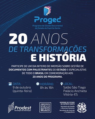 O Comitê Gestor do Programa de Gestão Documental do Governo do Estado do Espírito Santo (Proged) convida para o evento “Proged: 20 anos de transformação e história”, que acontece no próximo dia 9 de outubro (quinta-feira), a partir das 8 horas, no Palácio Anchieta, em Vitória. A participação é gratuita, mediante cadastro no link: https://forms.gle/T7kRRf5cDwJtaKjp9.