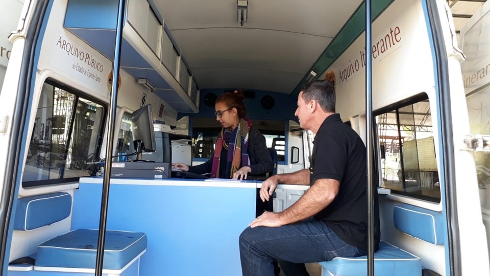 O “Arquivo Itinerante” dispõe de um veículo adaptado como escritório móvel para atendimento ao público e percorre o interior do Estado, a fim de viabilizar o acesso às informações do acervo histórico do Apees.