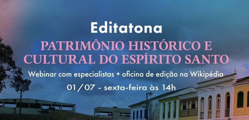 Na próxima sexta-feira (1º), às 14h, acontece a terceira editatona do Wikiconcurso Wiki Loves Espírito Santo, uma ação para estimular a criação de artigos sobre o Espírito Santo na plataforma Wikipedia. A live será transmitida pelos canais do Wiki Movimento Brasil (WMB) e da Secretaria da Cultura (Secult) no YouTube.